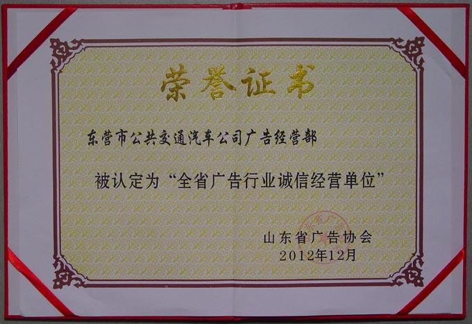近日,市公交公司廣告部獲山東省廣告協會頒發的2012年度“全省廣告行業誠信經營單位”證書,成為我市獲此殊榮的四家單位之一。