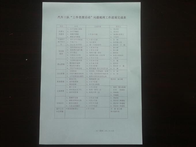 會上,車隊領導首先拋磚引玉,查擺梳理出車隊現行管理中存在的十個方面的問題,逐條進行了深入講解和剖析。隨后,車隊每名管理干部和管理人員也都對照自己的工作職責,從工作履職、工作態度、工作作風、工作效率四個方面進行了反思和查擺,客觀的分析總結了當前工作中的不足和存在的問題,提出自己整改的具體工作方向、整改步驟、整改的完成期限。