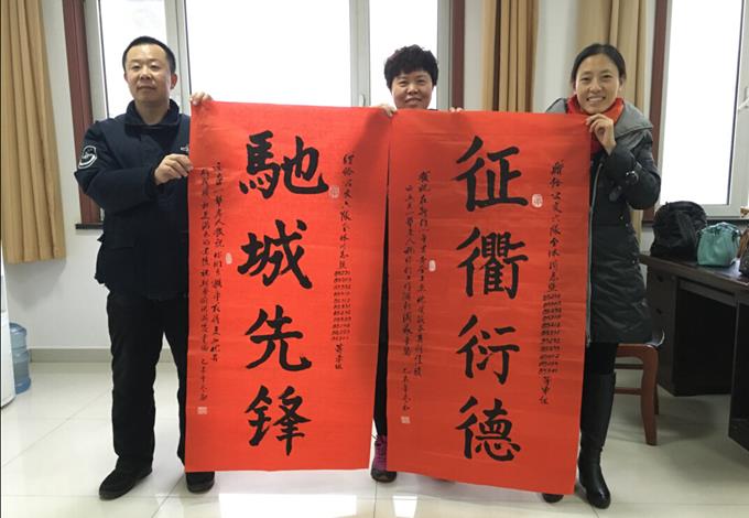 12月23日上午,家住雅苑小區的兩名乘客來到公交公司汽車六隊,將親手寫的三幅毛筆字作品交到了車隊工作人員手中。