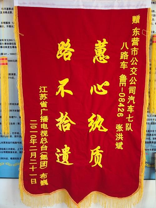 原來,2月20日,初次來東營走親訪友的失主布巍小酌后準(zhǔn)備返程,不小心將手提包丟在8路車上,內(nèi)有DV機(jī)、出國護(hù)照和工作證等物件,年后就準(zhǔn)備出國的他非常著急。經(jīng)過查詢與汽車七隊(duì)取得聯(lián)系,當(dāng)?shù)弥眯鸟{駛員張洪斌已將失物及時上交車隊(duì),失主布巍非常感動,因急于趕回單位出國,沒能當(dāng)面致謝,特寄來錦旗表示謝意。