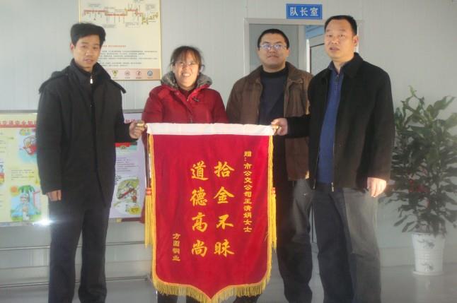 12月11日上午,東營經濟開發區方圓銅業的武繼峰先生拿著一面寫有“拾金不昧、道德高尚”的錦旗來到市公交公司汽車五隊,感謝161路駕駛員王清娟師傅拾金不昧的高尚品德。據車隊了解得知,12月9日晚上,汽車五隊駕駛員王清娟在運行完161路班次后正常清理車廂衛生時發現了一個女士皮包并立即將皮包上交車隊。車隊值班人員通過清點,發現皮包內共有現金、手機、鑰匙、身份證、個人用品等,根據包里面的手機信息及時聯系到了失主的丈夫武繼峰先生。12月10日上午武繼峰先生帶著有效證件來車隊將包領回?;丶液?,武繼峰先生心情久久不能平靜,特意制作了一面錦旗送到車隊,代表全家來表達感激之情,武繼峰先生拿著錦旗,握著王隊長的手,非常激動的連連表示感謝,并再三要求車隊對王清娟師傅這種拾金不昧的優良品質進行表揚。王隊長非常坦誠的告訴武繼峰先生,拾金不昧是我們公交行業多年來始終堅持秉承的優良傳統,也是每名駕駛員應盡的義務,是我們公交人義不容辭的責任。